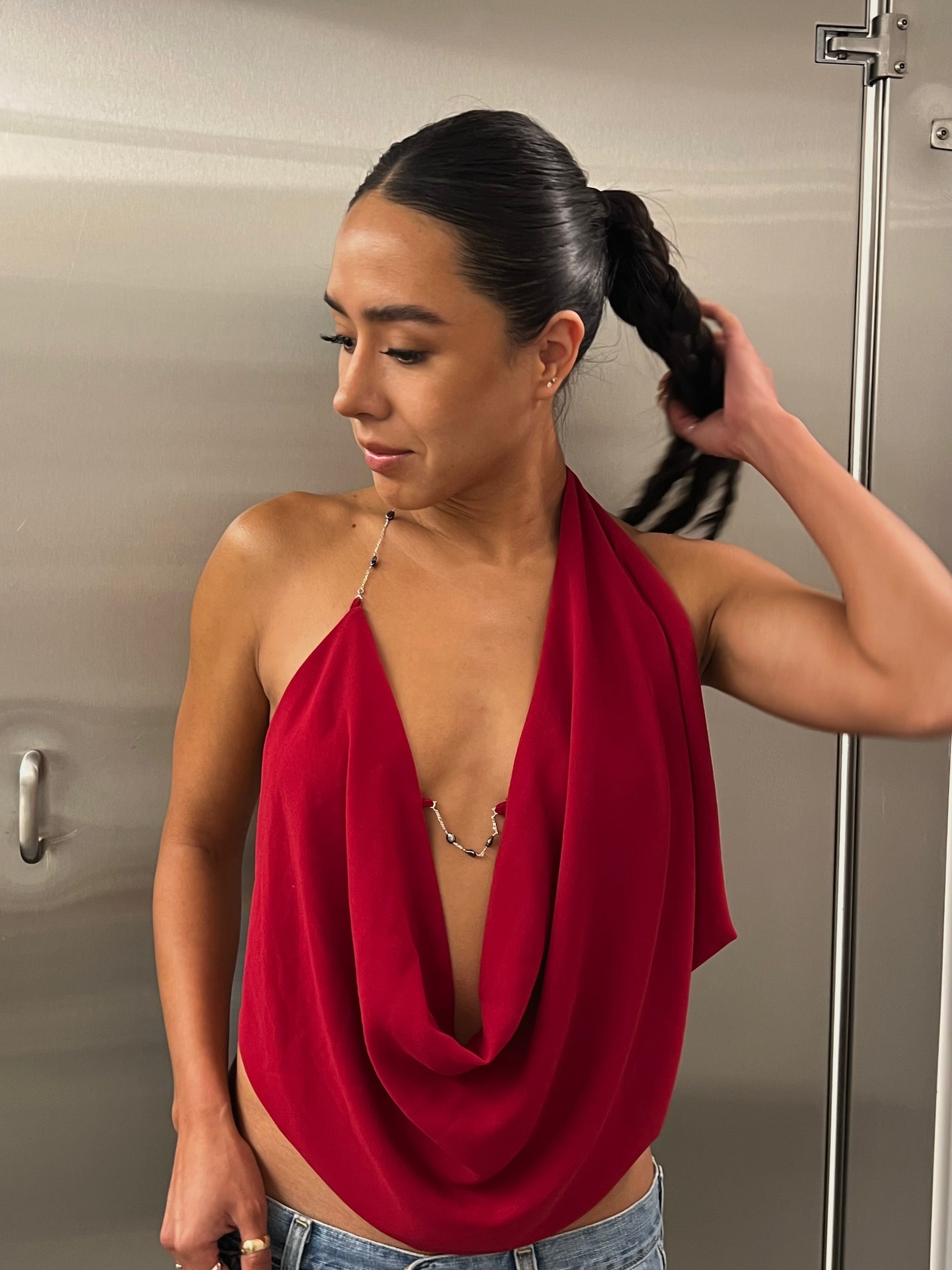 The Top Beli is a true statement piece, embodying femininity and sensuality. Made from delicate smoky red chiffon, it drapes beautifully over the body, creating a soft, effortless silhouette.