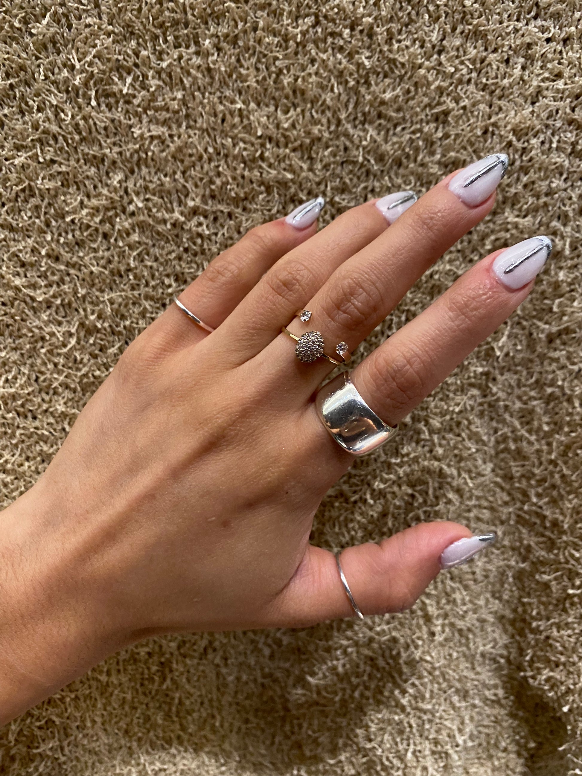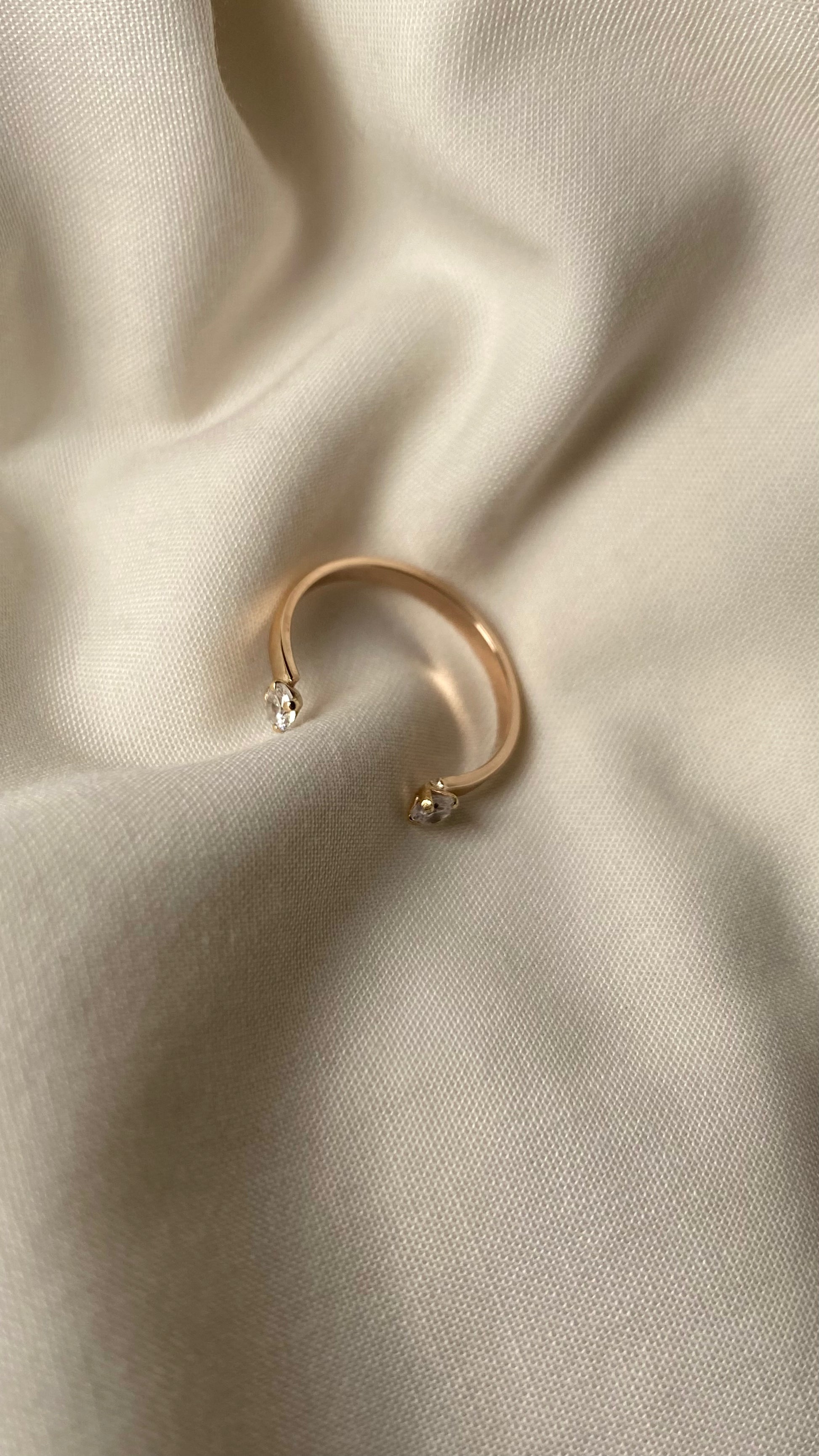 The Josefine ring is a striking blend of elegance and edge. Crafted in 10k yellow gold, this half-open band is adorned with two sparkling rhinestones, one on each side. Offering a unique and bold look.