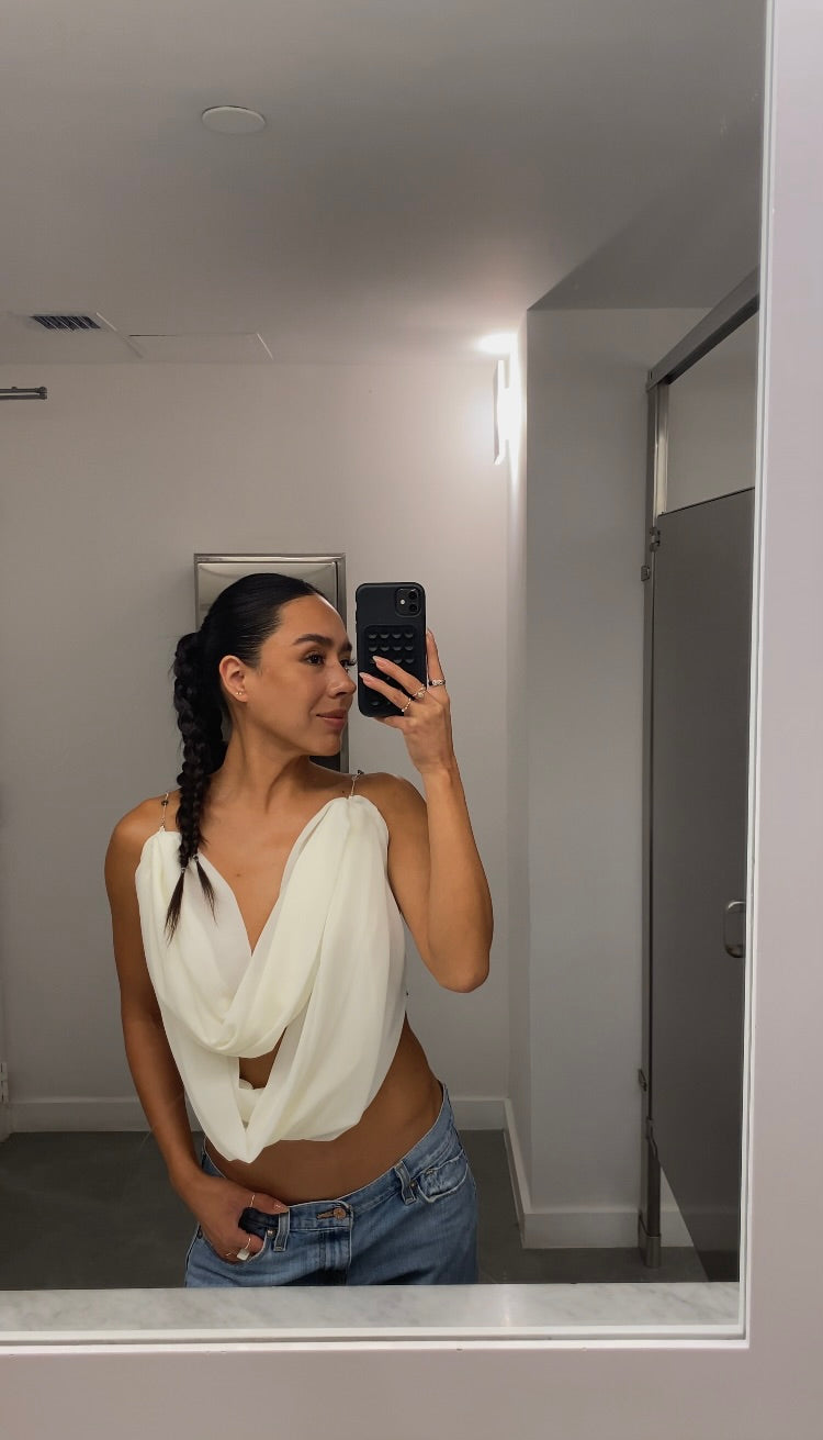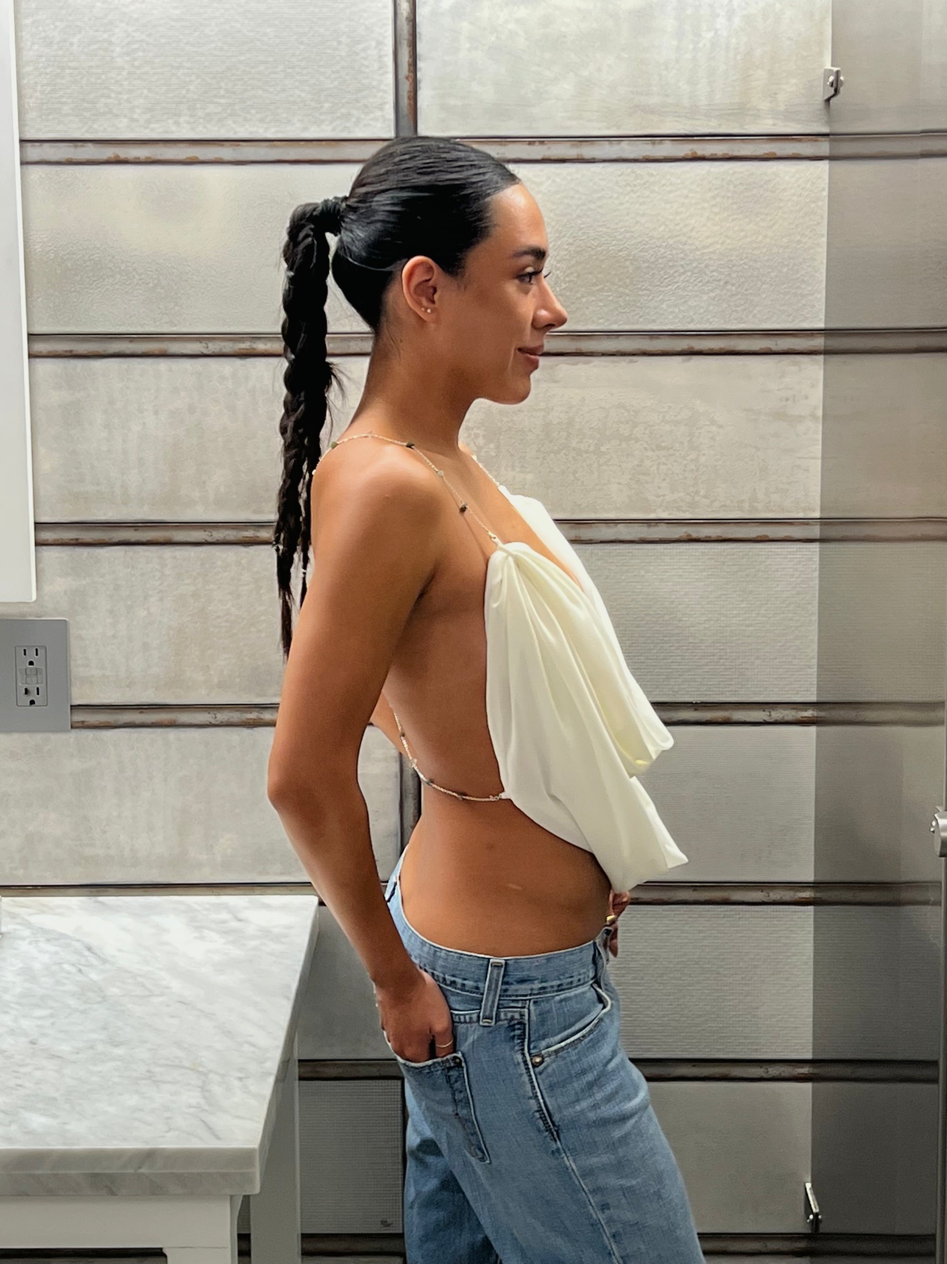 The top Lunna channels quiet strength and refined elegance. Made from delicate white chiffon, it drapes effortlessly over the body, creating a weightless silhouette that is both graceful and captivating.